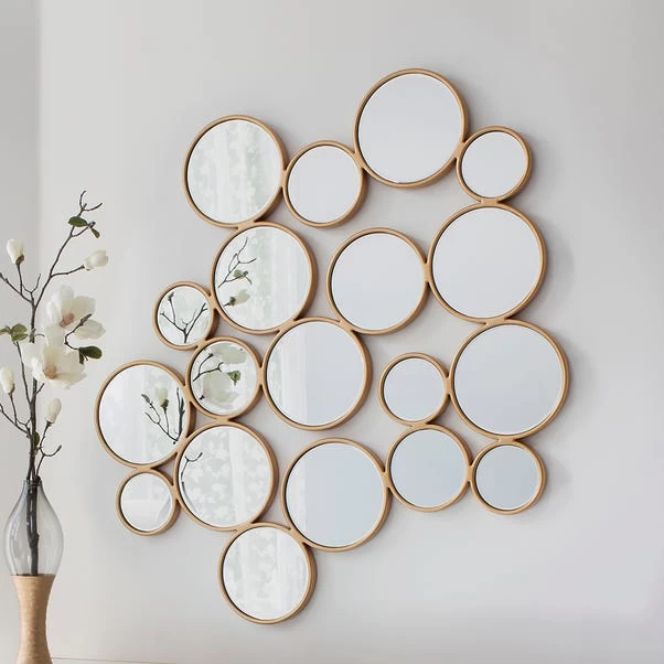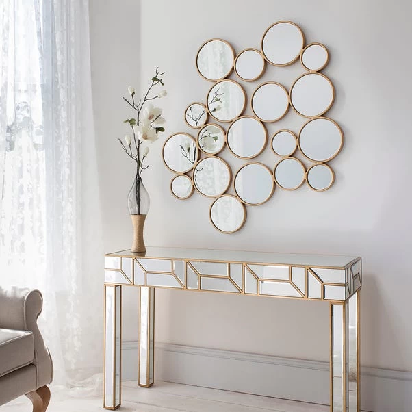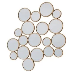 Create a bold and dazzling statement with the contemporary and unique styles of the Ariton Mirror. Consisting of several different sized round mirrors clustered together to create this stunning piece, it is finished with a soft gold frame for a luxurious modern look.