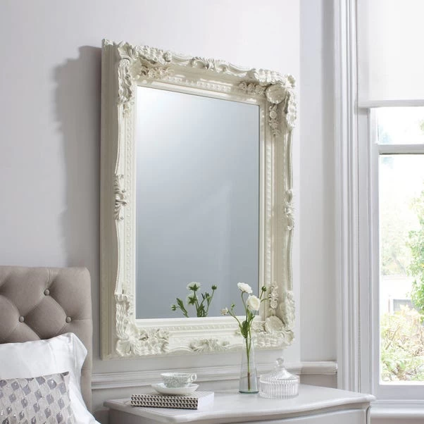 Make a statement with the elegant Carved Charlton mirror. A timeless elegant mirror which features a dramatic baroque solid frame completed in a sophisticated matte cream finish, a piece to transform any room or alcove to an attractive space.