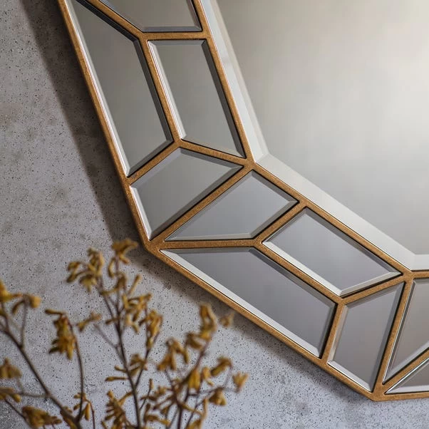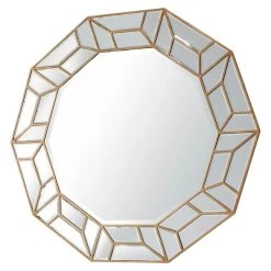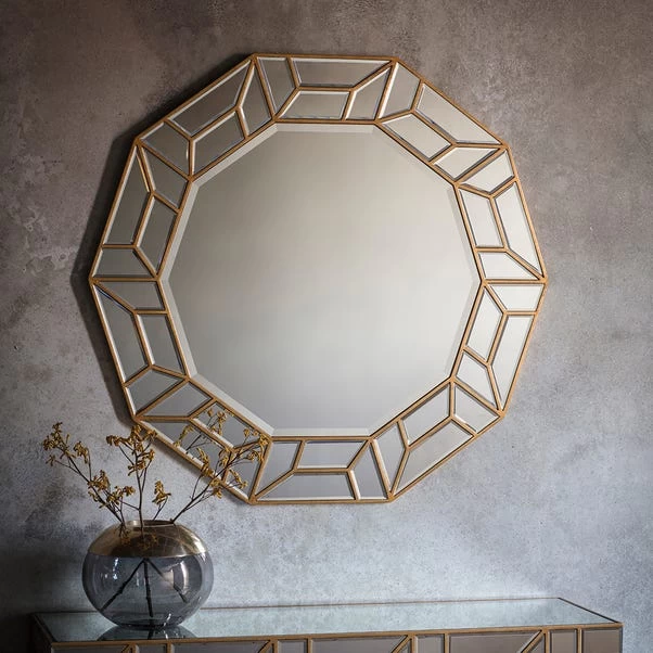 Presenting the majestic Woodbery Mirror, a large decagon shaped mirror with a decorative gold pattern on the frame. With and impressive structure and grand size, this piece is ideal for creating a statement or filling a blank wall.