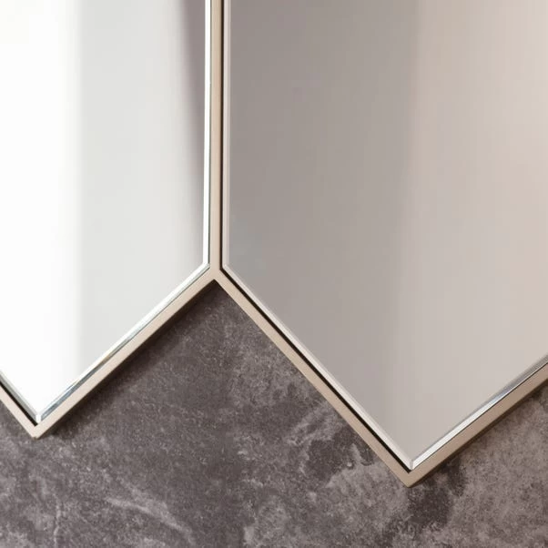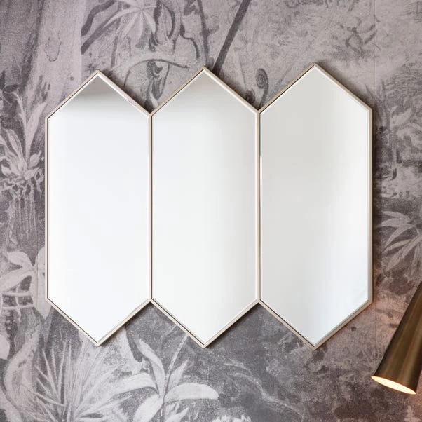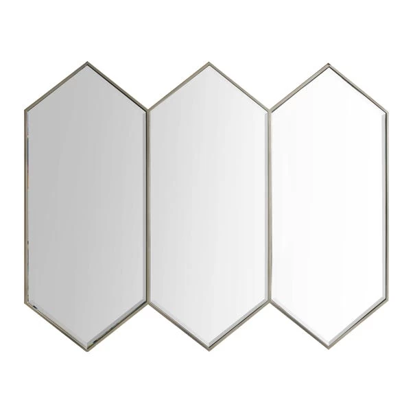 Introducing an eye-catching geometric mirror that will add a dash of vintage inspired elegance to your home. Featuring three irregular hexagons with subtle silver metal frames, this accent mirror is perfect for adding an eye-catching finishing touch to any room.