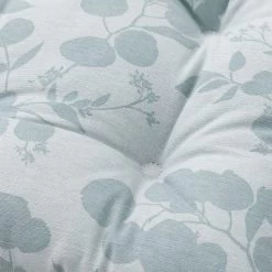 This seat pad features a stylish pattern of eucalyptus leaves in an elegant seafoam tone complimenting any kitchen and dining room beautifully. Made from 100% Cotton and filled with recycled polyester fibre for comfort, the seat pad has two practical ties to fasten to your chair. Coordinate with other matching items to complete the look.
