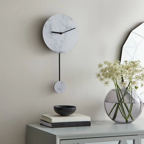 Designed with uncased hands, this pendulum quartz clock with step movement has a marble effect face that will add a stylish touch to any room of the house. The modern colourway will complement an array of decors beautifully, making this clock perfect for your home.