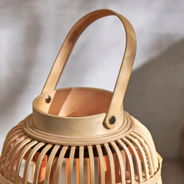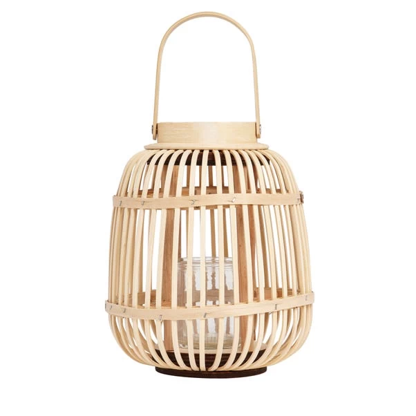Featuring a stylish natural bamboo lantern, guaranteed to make a statement in any room with its large structure, natural raw appeal, striking handle feature, and ability to create a warm glow when lit with a candle inside. The cage like bamboo design not only provides an enclosed protected feel, but also creates an openness with the gaps, allowing it merge into other interior details of your house.