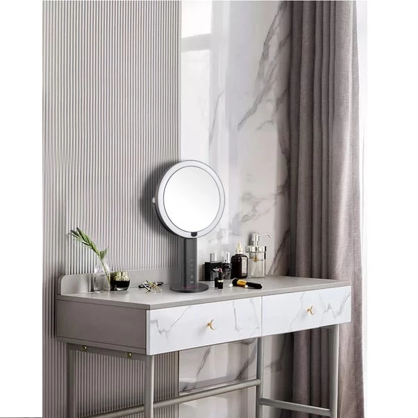 Even in your darkest rooms, the EKO iMira Pro will offer outstanding visibility. So use the powerful LED light to help light up your face to help you achieve the most glowing of makeup looks. No matter the stage of your routine, this mirror has 2 sides and offers you both 1x and 5x magnification. Having an adjustable brightness (LUX 1100, CRI 96) combined with a choice of 3 light tone settings allows for a variety of looks. Natural simulates natural sunlight for daytime looks, cool bright light helps show fine definition of detail and indoor warm lighting is helpful for evening occasions. The automatic on/off sensor detects when you are in front of and away from the mirror: the mirror turns off 12 seconds after you move away. One charge of the will last you up to 4 hours of continuous use or around 3-4 weeks of average daily use. The mirror comes with a 1-year manufacturer warranty.