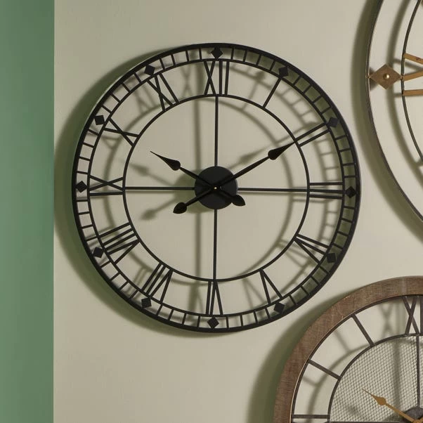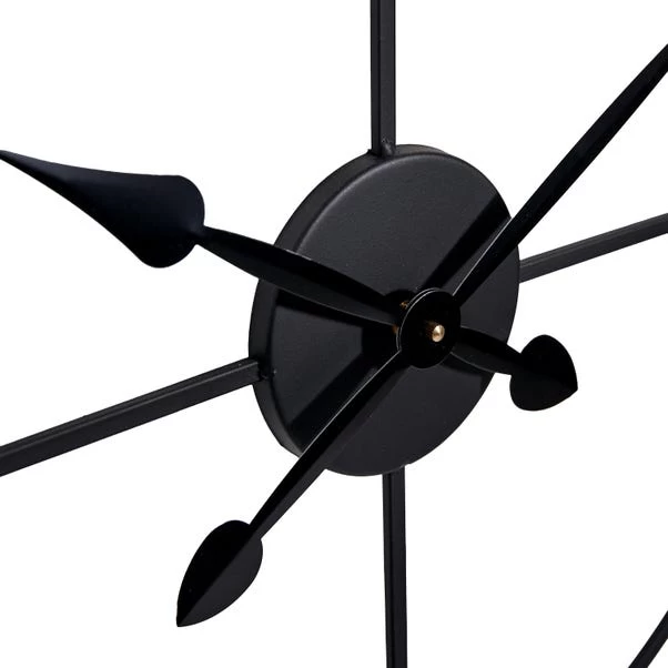 Simple and stylish, this modern skeleton clock is presented in a bold black colour and perfect for adding a practical and ornamental attraction in your home. Featuring roman numeral figures to indicate the time, arrow styled hands, and a contemporary circular shape, this wall clock will add timeless style to your home and suit a range of interiors.